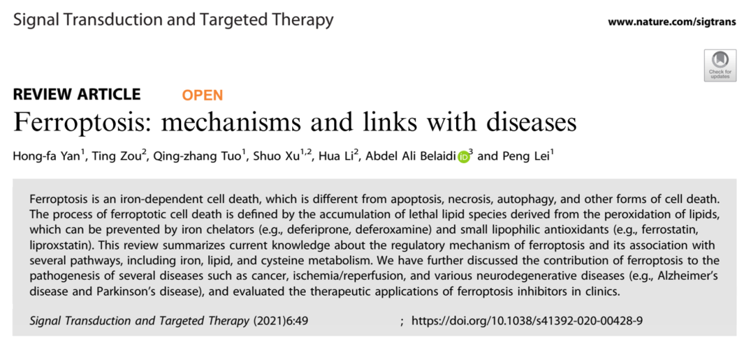 近日,四川大学雷鹏团队在Signal Transduction and Targeted Therapy杂志上发表综述文章Ferroptosis: mechanisms and links with diseases,从铁死亡研究的发展史入手,阐述了铁死亡的调控机制,描述了铁死亡与相关疾病如癌症、神经退行性疾病和缺血再灌注损伤等之间的联系,并讨论了铁死亡在相关疾病治疗中潜在应用价值。