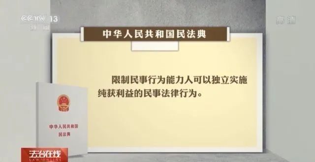中国政法大学教授 夏吟兰:民法典当中对于民事法律行为做了一个三级的规定,第一级别是完全民事行为能力人,也就是我们通常讲的成年18周岁以上;第二级别是限制民事行为能力人,规定的是8周岁以上;第三个级别就是8周岁以下,是无行为能力人,所以8周岁实际上是限制行为能力和无行为能力的一个分界线。
