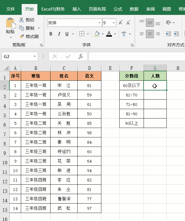 问题:上面统计了两个分数段的成绩,用到了两个公式,我们也可以用一个数组公式来完成统计多个分数段人数。