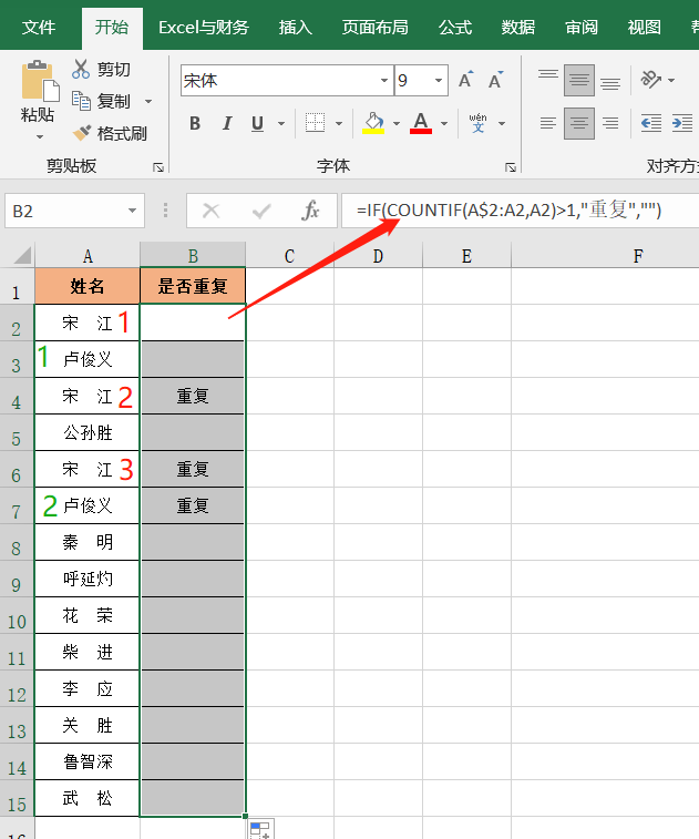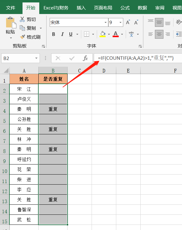 用法:在B2单元格输入上面的公式,回车键确认公式后,再双击或下拉填充公式,重复姓名会显示“重复”两个字。