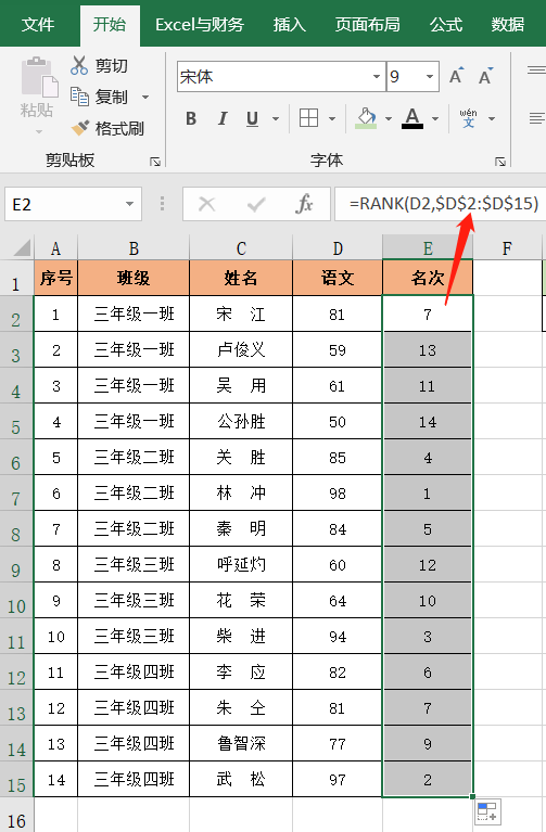 在E2单元格输入上面的公式,回车键确认公式后,再下拉或双击E2单元格填充柄填充整列公式,即可得出名次。