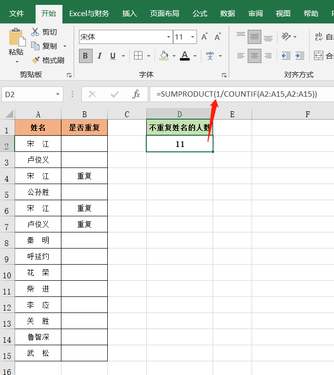 公式:=SUMPRODUCT(1/COUNTIF(A2:A15,A2:A15))