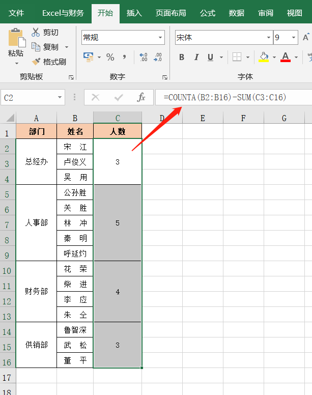 用法:首先选中所有合并单元格C2:C16区域,然后输入上面的公式,公式输入完成后按Ctrl+回车键确认公式,即可得到人数。