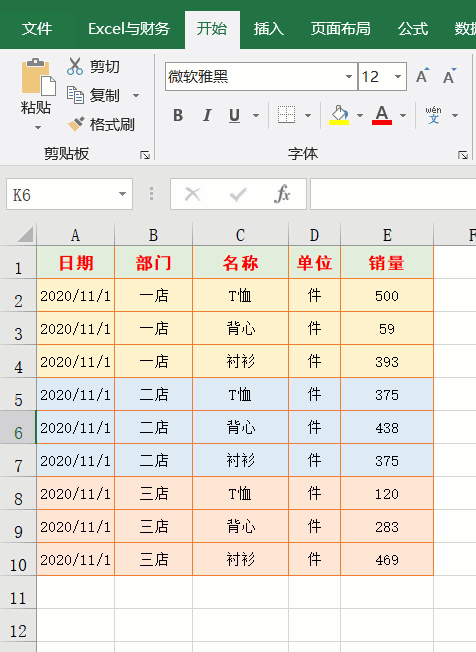 选中需要填充颜色的一行,鼠标点击【开始】选项卡中的【填充颜色】按钮,选择需要的颜色,保持已填充颜色这一行选中状态,鼠标双击【开始】选项卡中的【格式刷】按钮,然后依次点击其他需要填充颜色的行,完成后按Esc键取消格式刷功能,完成隔行填充颜色。