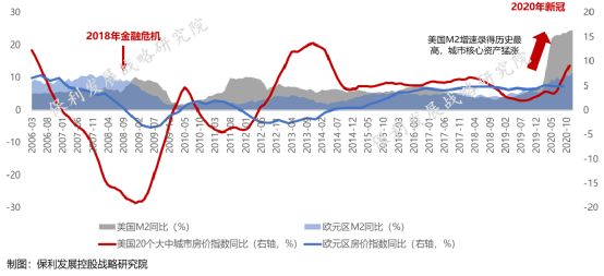 疫情后货币宽松的结构性流向,寻找蓄水池。为刺激经济复苏,全球各国央行开水放闸,超低利率、无限量QE、扩大财政赤字,掀起货币宽松浪潮。2020年美国M2同比增长25%,欧元区M2同比增长11.7%,均创历史新高。