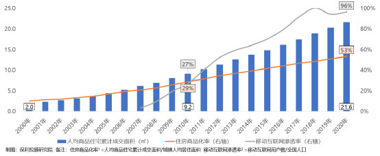 大幅提升的住房商品化率与移动互联网率为不动产服务兴起创造空间与信息载体条件。峰值时代新房交易维持高位区间,存量资产快速积淀,十年间住房商品化率从29%跃升至53%。居住空间载体全面社区化,商业、办公、产业组织形态持续迭代。另一方面,移动互联网全面渗透、革新个体信息媒介触点,数字化建设为不动产服务规模化提供基础设施。