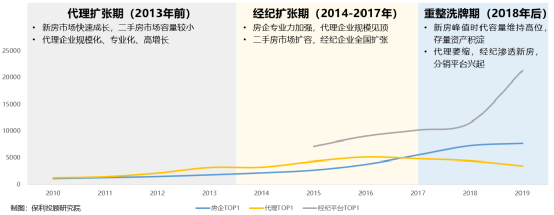 回顾房地产交易服务发展历程,先后经历了新房代理扩张期(2013年前),存量经纪扩张期(2014-2017年),当前进入平台崛起期(2018年至今)。平台对行业重塑,是利用互联网工具改造原有商业逻辑,重造市场生态。典型企业从二手经纪直营机构转型 “科技企业+互联网平台”,通过互联网数字化能力,放大ACN经纪人合作机制能量,形成线上线下交易闭环;业务破界“先竖再横”,由二手房直营为主转为覆盖新房和二手房联卖,并从交易服务向金融服务、家装服务等延伸。