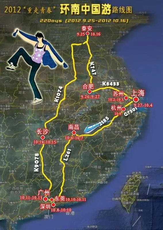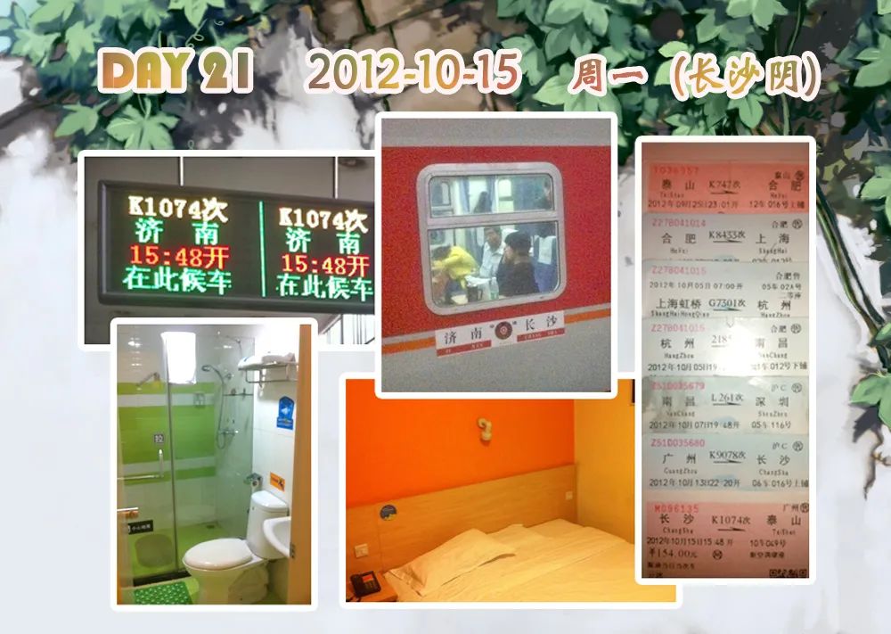 [题文导读] 2012年10月14日清晨六点半自第九站广州乘K9078次卧铺抵City10长沙,当晚落宿于火车站附近7天连锁酒店朝阳家润多店,15日下午三点半许搭乘K1074次列车硬座离境返乡回山东,16号上午九点到泰山站,十点半搭顺风出租车到莱芜家中,旅程结束。