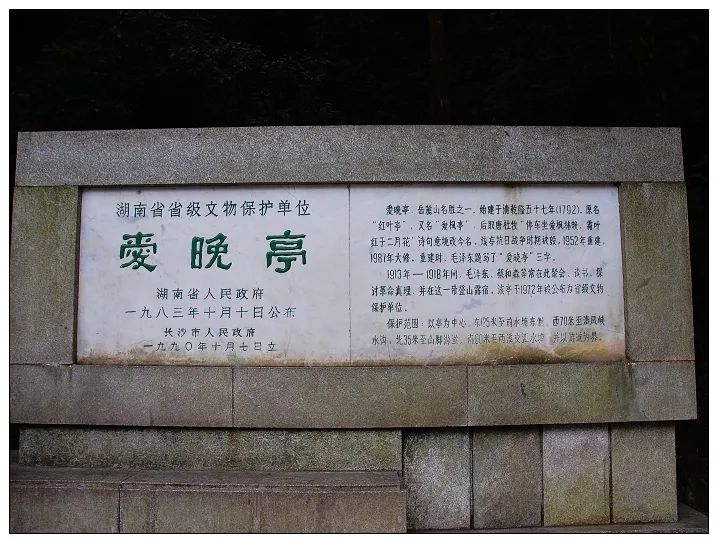 山上非但植被茂密,而且空气清新,各类文化名迹更是数不胜数,其中最不乏的就是各类近代史人物的碑石坟冢。上到革命先驱黄兴蔡锷,下到被红军活捉了的国党枭首张辉瓒,但凡和湖南有所渊源的,大多埋骨于此。说到岳麓山最知名、也是游人最趋之若鹜的一处景点,还属有毛泽东题字的爱晚亭。它因杜牧的《山行》诗“停车坐爱枫林晚”而得名,与滁州醉翁亭、北京陶然亭、杭州湖心亭并列中国四大名亭之一。与普受公认的四大名楼相比,四大名亭的说法听上去更像是牵强附会来的一个噱头;虽然属于历史遗迹,但毕竟普天下的亭子都长得一个模样,搞不懂为何会这么出名。