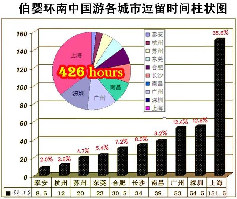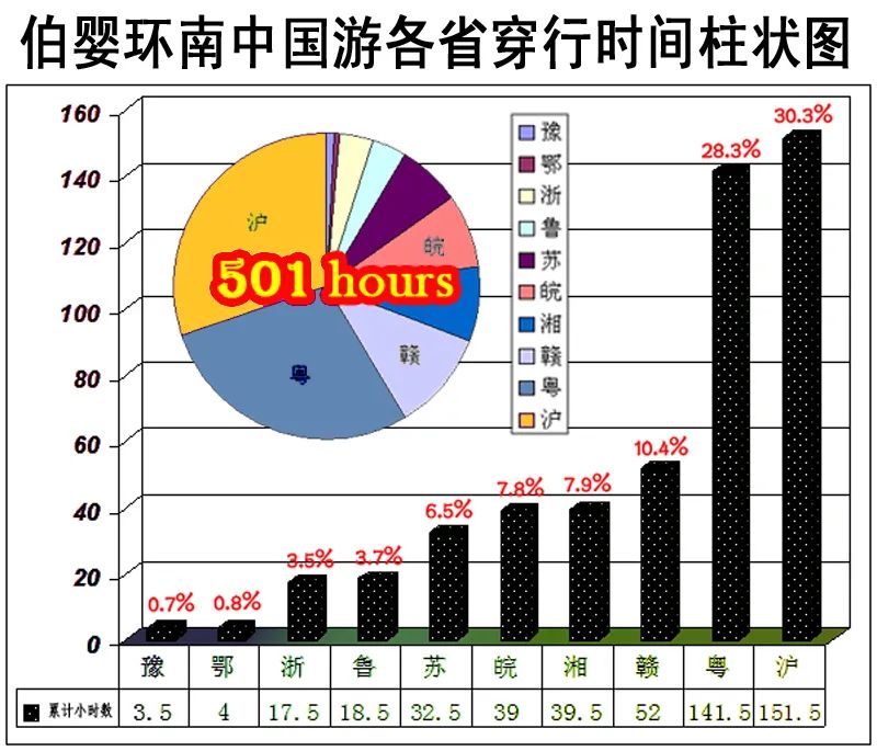 通过上文的交代,“伯婴环南中国游”的时间跨度为22天,有效游览时间为501小时,这个时间刷新了去年十月自己周游“青大沈京”一线时创下的14天340小时的原有记录。但用这501小时逛十省十市,这些时间究竟是怎么被分配到各省区市去的呢?下面将从不同的角度给出剖析结果。