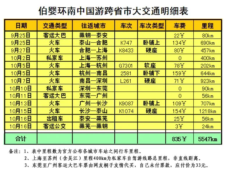 最后附我此次旅行事后盘点的几项记录:一、 最长的火车之行: 10月15日,K1074次,长沙—泰山,1218km,17.5小时;二、 最长的客运汽车之行:10月11日,东莞—广州,56km;三、 最长的地铁之行:9月30日,上海,杨浦区江湾体育场—徐汇区交通大学, 16.4km;四、最长的公交之行:9月29日,上海,855路,天山西路剑河路—广元西路恭城路,>15km;五、最长的私家车之行:10月2日至3日,上海—苏州(吴江)—上海,全程400km;六、最长的出租车之行:10月8日,深圳,会展中心—石厦益田路附近,3.5km,15.4¥;七、最长的水上轮渡之行:10月12日,广州珠江,海珠区中山大学码头—荔湾区芳村码头,6km;八、最长的徒步暴走之行: 10月5日,杭州,自河坊街—吴山公园—西湖柳浪—断桥—孤山西泠桥—断桥,10km; 九、最安逸的交通经历: 10月5日,上海—杭州,202km,高铁软座,1小时; 十、最悲催的交通经历:10月7日,南昌—深圳,923km,临客硬座,15.5小时。
