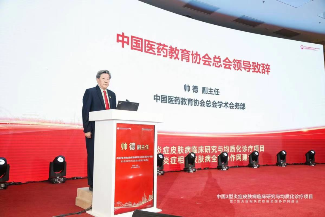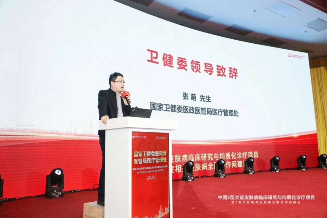 中国2型炎症皮肤病项目启动仪式上国家卫健委医政医管局医疗管理处张萌先生、中国医药教育协会总会学术会务部帅德副主任都发表了致辞。