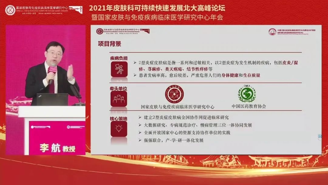 图:李航教授介绍中国2型炎症皮肤病临床研究与均质化诊疗项目立项背景