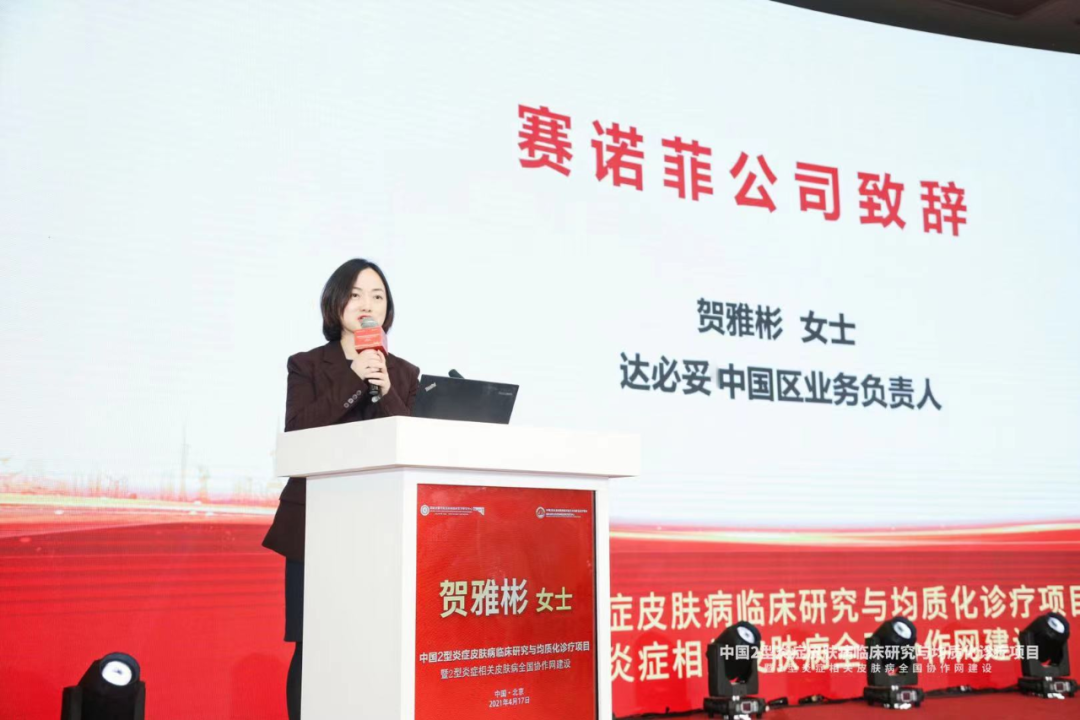 中国2型炎症皮肤病临床研究与均质化诊疗项目是由国家皮肤与免疫疾病临床医学研究中心和中国医药教育协会共同发起和主办。赛诺菲公司志愿为该项目提供外围服务,故此大会邀请度普利尤单抗中国区业务负责人贺雅彬女士致辞。贺雅彬女士致辞中强调赛诺菲完全是公益性支持此项目,不干涉具体研究也不会涉及临床数据。
