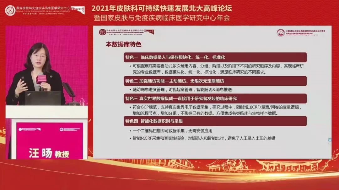 精彩学术分享之后,北京大学第一医院皮肤科汪旸教授带来了《2型炎症皮肤病数据库及评估体系介绍》,她的演讲从数据库介绍、协作单位认证框架及流程、协作单位认证评分标准、维持认证评分标准四个方面展开。