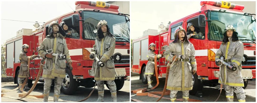 于是两个儿子借来消防车和制服,全家齐上阵cos消防员,诞生了创意全家福的第一张: