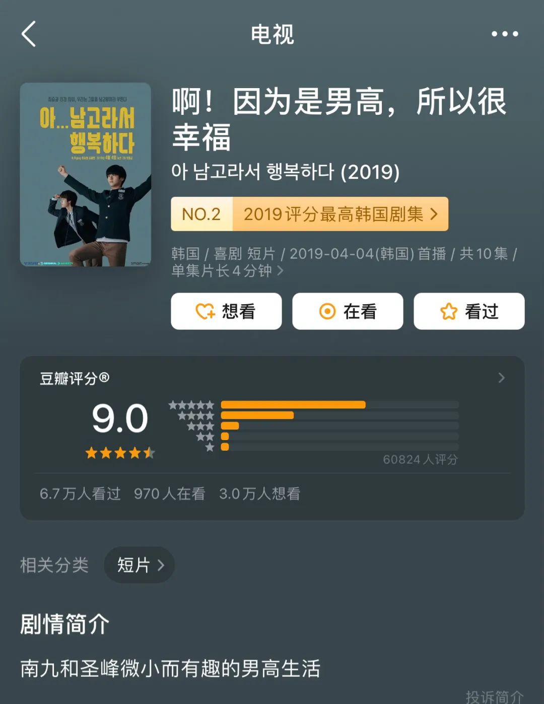 2017年,讲述了两个男人的同居故事、每集只有6分钟长度的《暧昧男子》上线;2018年,校园题材的青春爱情网剧《A-TEEN》播出,在播放平台YouTube和VLIVE每集观看次数都突破了100万;2019年,一部由两位乐队偶像组合成员出演的迷你剧《啊!因为是男高,所以很幸福》在韩国大火,虽然每集只有4分钟,但笑点铺设密集,叙述方式也更加互联网化,在豆瓣2019年上线的韩国剧集中评分排名第二。