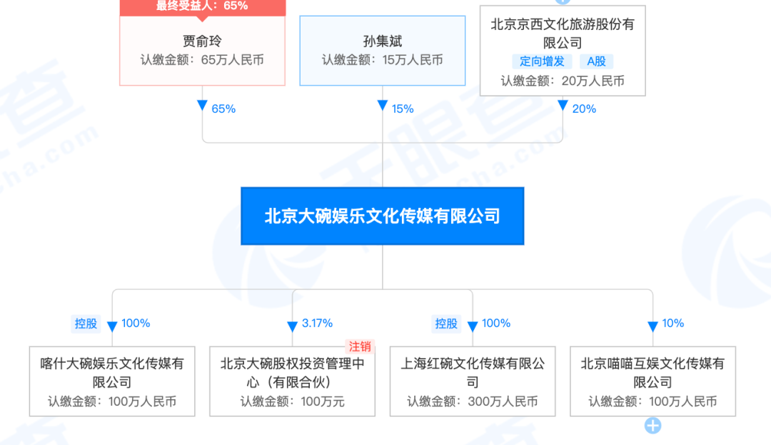 而据天眼查数据显示,在大碗娱乐的持股中,贾玲本人又占了65%。
