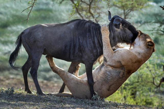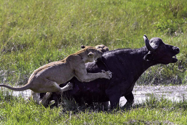 如下是正在捕食的两头狮子,如果得手,这将会是它们狮子族群今日的午餐。看着很是残酷,但是牛和狮子,都是生态圈中的一员,维持着微妙的平衡。