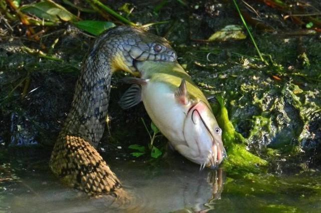 一个是因为蛇的毒液,另外一个就是因为蛇进食的恐怖吧。如图是一条被蛇抓住的鲶鱼,这将是未来几天,蛇的食物,它会把鱼整个吞掉,然后慢慢消化。