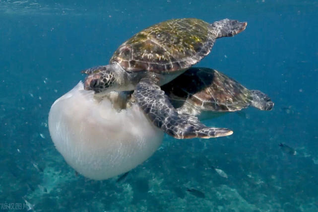 看海龟的样子,总是慢吞吞的,很是悠闲,不过海龟可是个十足的肉食主义者,如下是在蚕食水母的绿海龟。小时候听老人说,要是被乌龟咬到,不打雷乌龟是不会放开的,你说这是真的呢?
