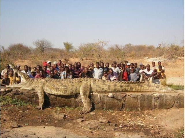 如图是非洲的村民和一条大鳄鱼在合影留念,这是它们捕获的吗?这么大的鳄鱼,不知道有没有1吨呢?