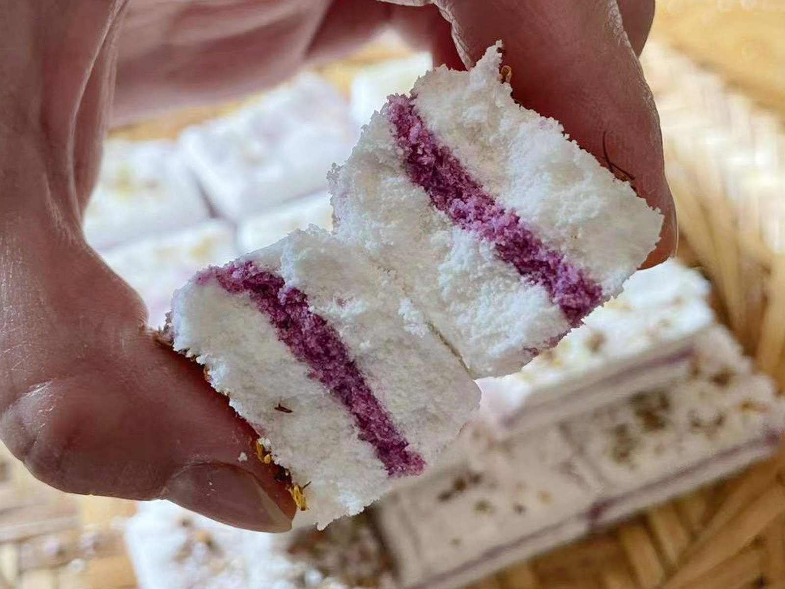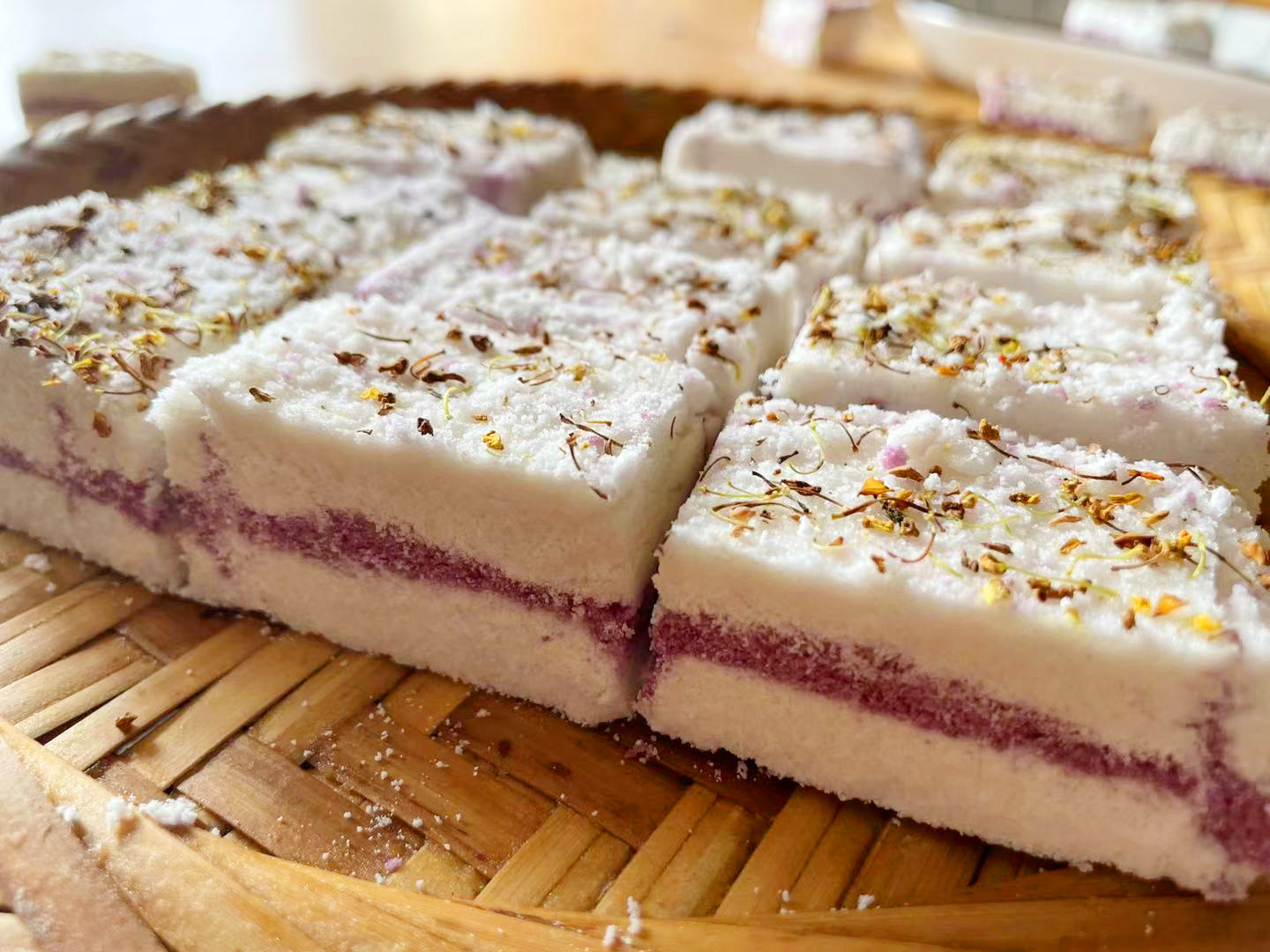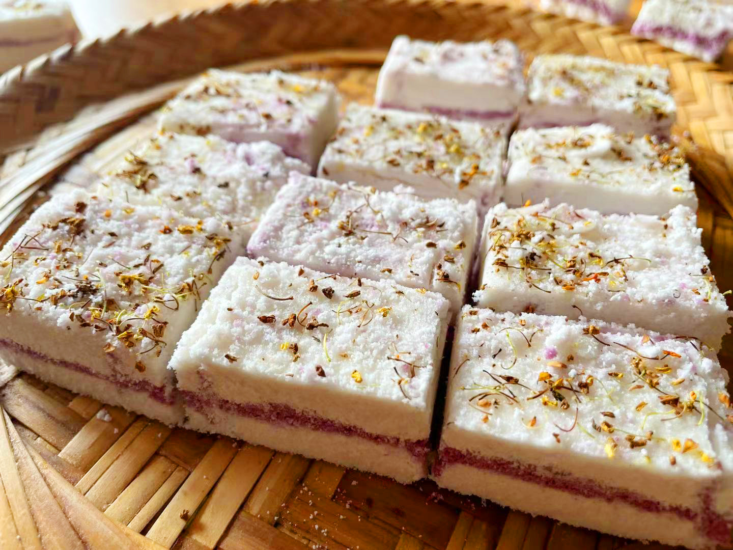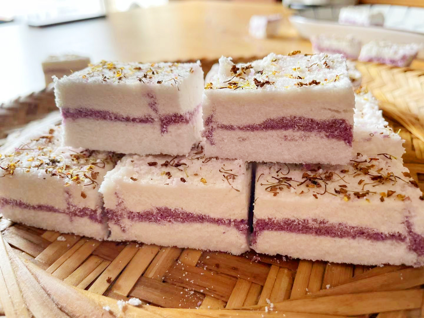 用这个方法做出来的桂花糕,每一块都是松松软软的,质地细腻,打开以后中间是非常漂亮的紫色夹心,口感清甜,入口即化,有浓浓的桂花香味,超级超级好吃。