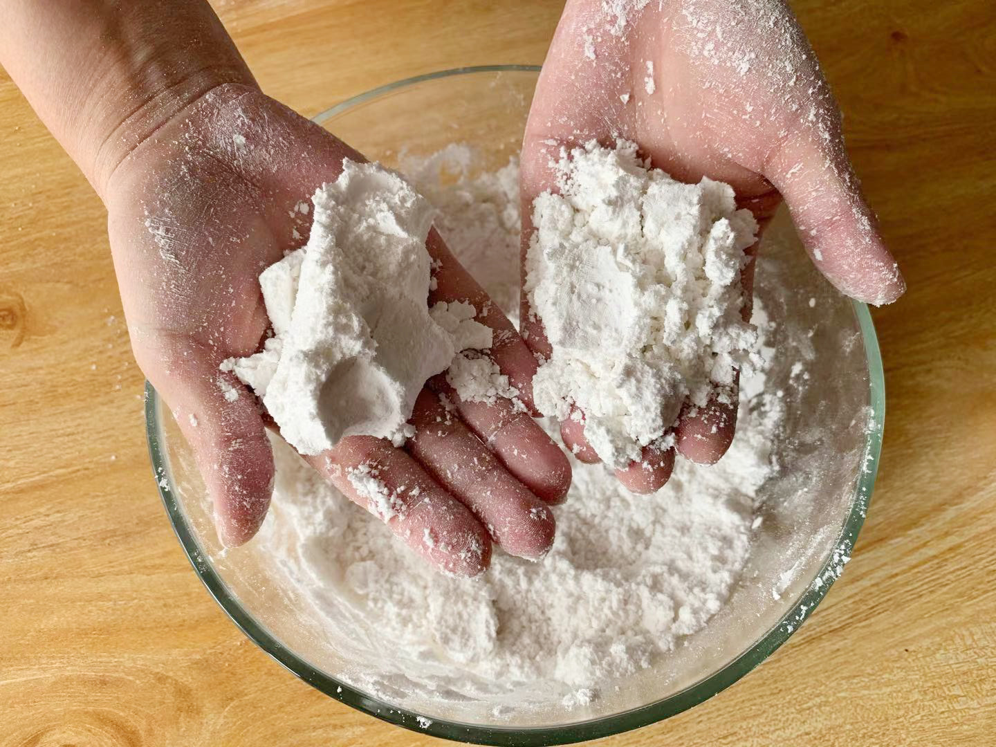 3、最终要搓到所有的粉都是湿粉的状态,用手一攥就能成团,然后把面团轻轻打开后还是粉的状态即可。如果把握不好,可以参照图中所示,左手是团成面团的状态,右手是面团打开的状态。