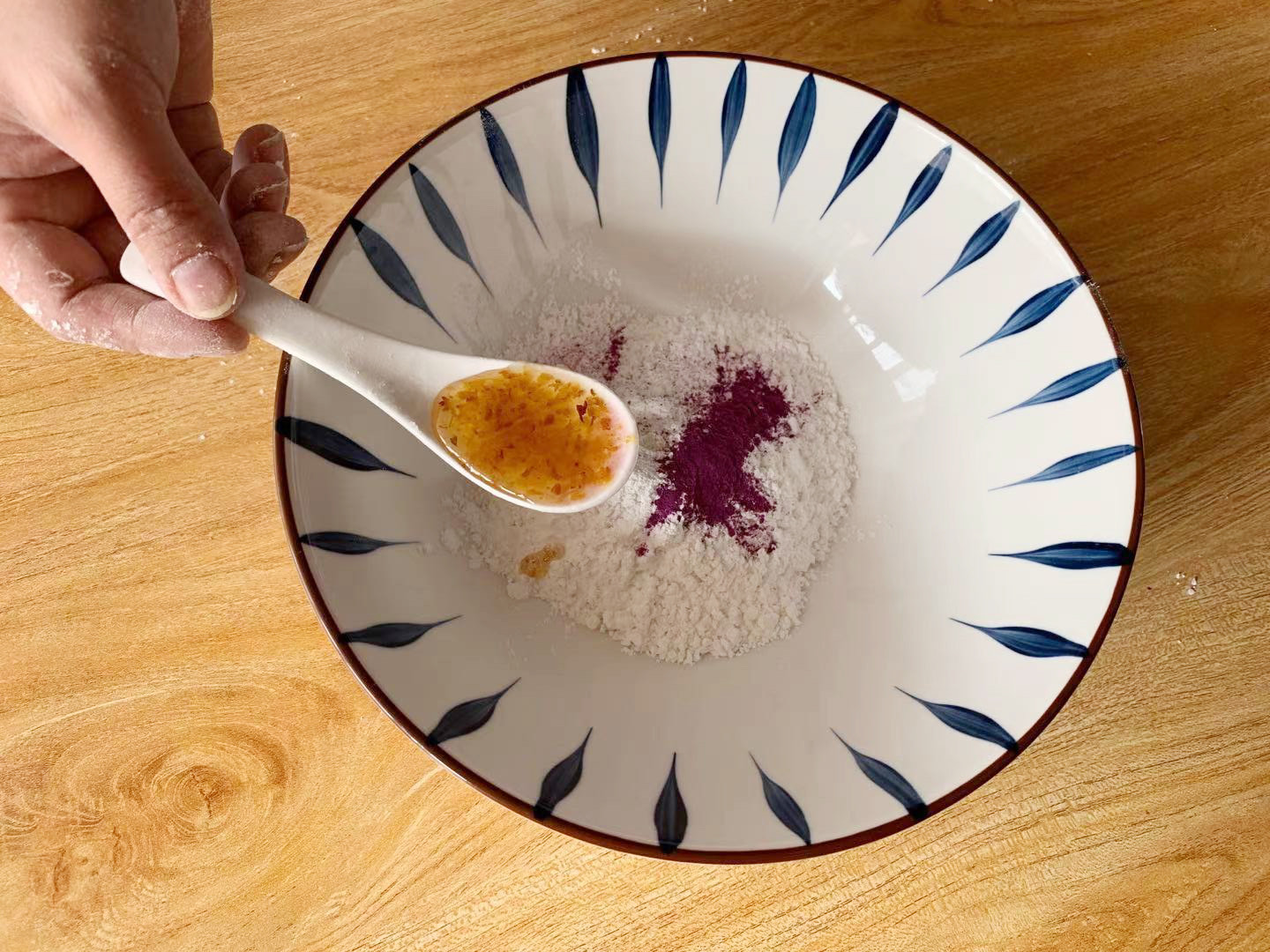 4、接下来领取一个大碗,放入两大勺粘米粉,加入一大勺紫薯粉,再淋入一勺糖桂花,同样先把盆中的面粉搅拌均匀后,少量多次的加入冷水,同样需要我们搓到可以团成团的湿粉状态,但是把粉团打开后是散粉的状态,紫色桂花部分就做好了。