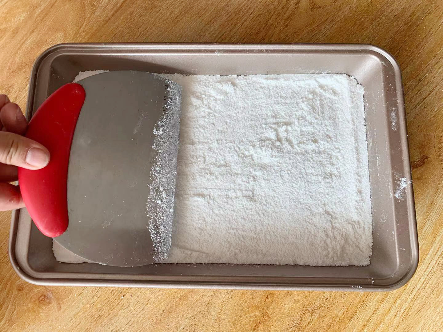 6、准备一个干净的,无油无水的烤盘,首先放入二分之一的白色米粉,用刮板将米粉铺平,尽量铺的薄厚一致、表面平整,然后再铺上紫色桂花部分的米粉,同样用刮板铺平后,表面撒上剩下的二分之一白色米粉,用刮板整理平整后,稍微给它压瓷实一点点,千万不要压得太瓷实,不然就会蒸不透了。