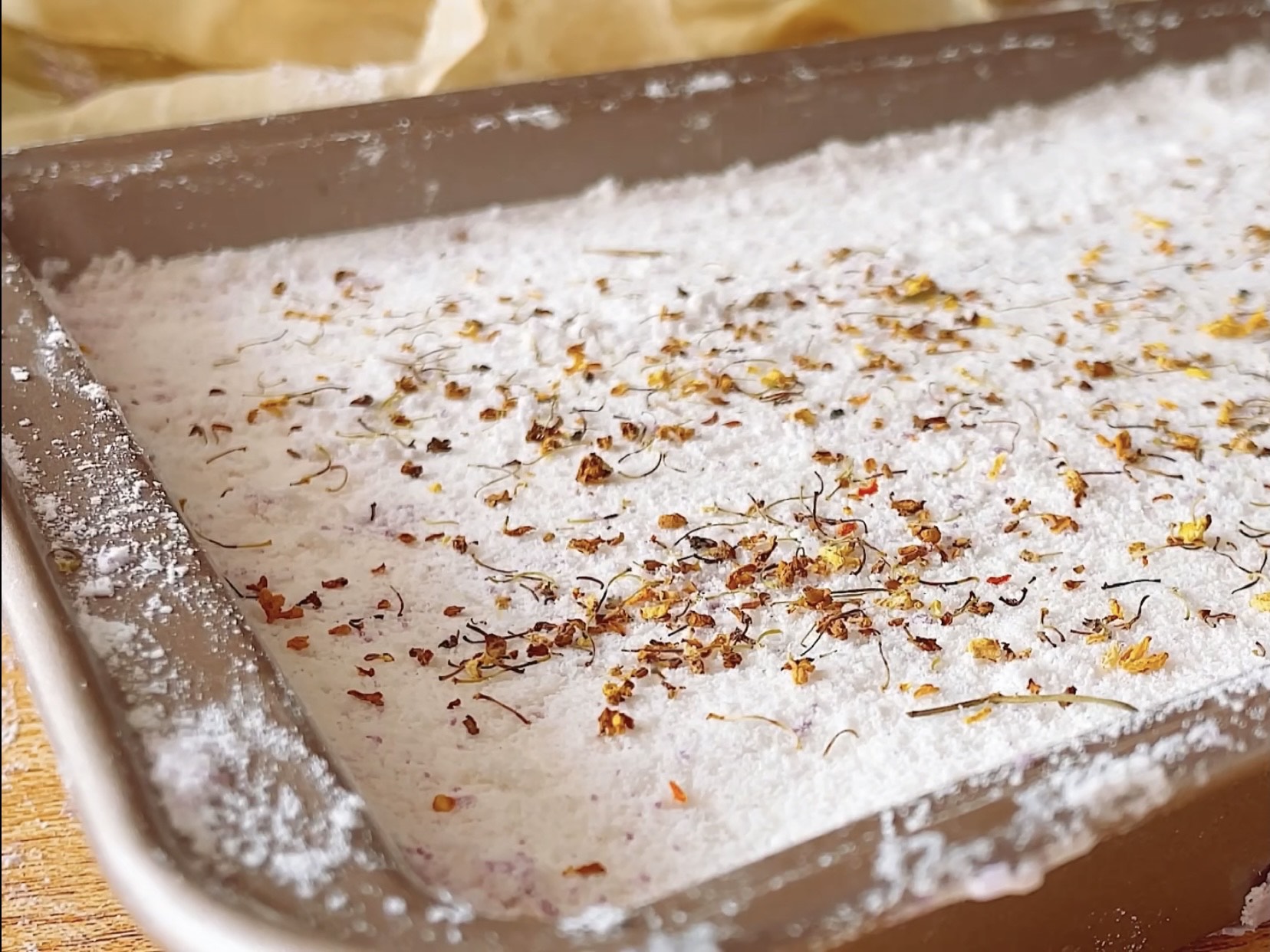 7、表面撒上一层 干桂花,然后用刮板轻轻的切割成长方形的小块,这样蒸好以后就更容易脱开模具了,直接放入蒸箱,蒸25分钟的时间即可。