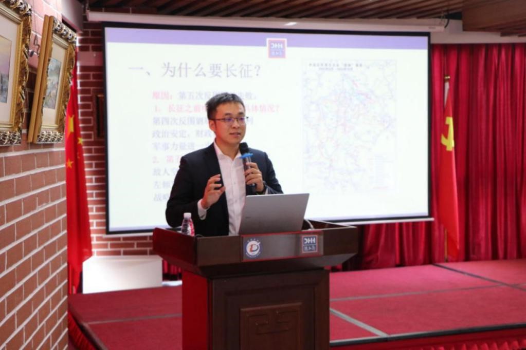 党课活动由山东德衡律师事务所党委宣传委员吴学联主持。青岛市革命烈士纪念馆巾帼宣讲团成员黄腾、刘茜茜、纪晓彤将详实史料与诗朗诵《青春中国》、视频资料相结合,激情讲述杨靖宇、张富清、祁发宝、王一民、邓恩铭等共产党员英雄人物事迹,从信念坚定地“眼眸”、不念功名的“唇舌”、为民报国的“红心”、敢于担当的“铁肩”、廉洁拒腐的“傲骨”五个方面展现了共产党员的光辉形象。李修超律师细致讲述了红军长征的历史背景、基本路线、发展阶段及其对于中国革命的重大意义。主讲人们声情并茂的分享,带领与会同志们重温那段波澜壮阔的历史,倡导听党话、感党恩、跟党走的中国特色社会主义新风尚,秉承革命先辈前赴后继英勇斗争的精神和传统。“听党课、学党史”活动在共同唱响《没有共产党就没有新中国》中达到高潮,全场人员心潮澎湃,现场气氛热烈。