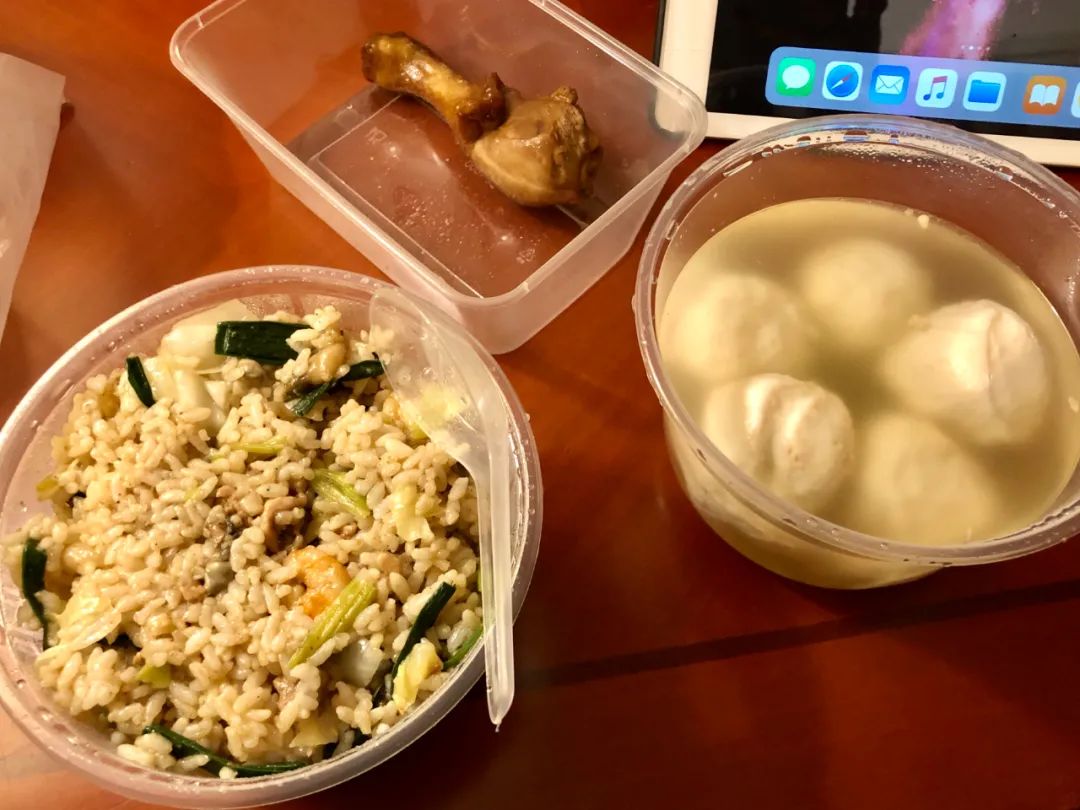 跟想象中有些不同的是,眼前这一桌子,除了那只卤鸡腿曾在沙县小吃里打过照面,剩下的都是没见过的东西,加了海蛎子和虾仁的炒饭对非沿海地区人士来说可谓豪华,配上咸酸口的鱼丸汤解腻,还真是海陆空齐全。
