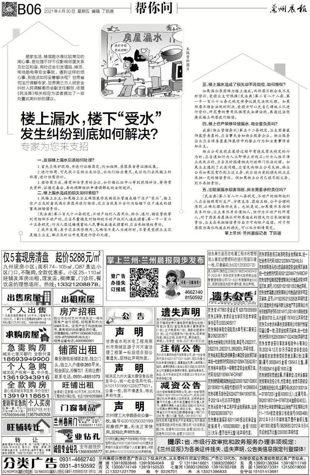 居家生活,楼层跑水是比较常见的闹心事,若处理不好不仅影响邻里关系及社区和谐,有时还会引发塌陷、掉顶、电线跑电等安全事故。遇到这样的烦心事,到底该如何妥善解决呢?甘肃省司法厅调解专家、甘肃第三方人民安全纠纷人民调解委员会副主任解放,依据《民法典》相关规定为读者提出了一些处置此类纠纷的建议。