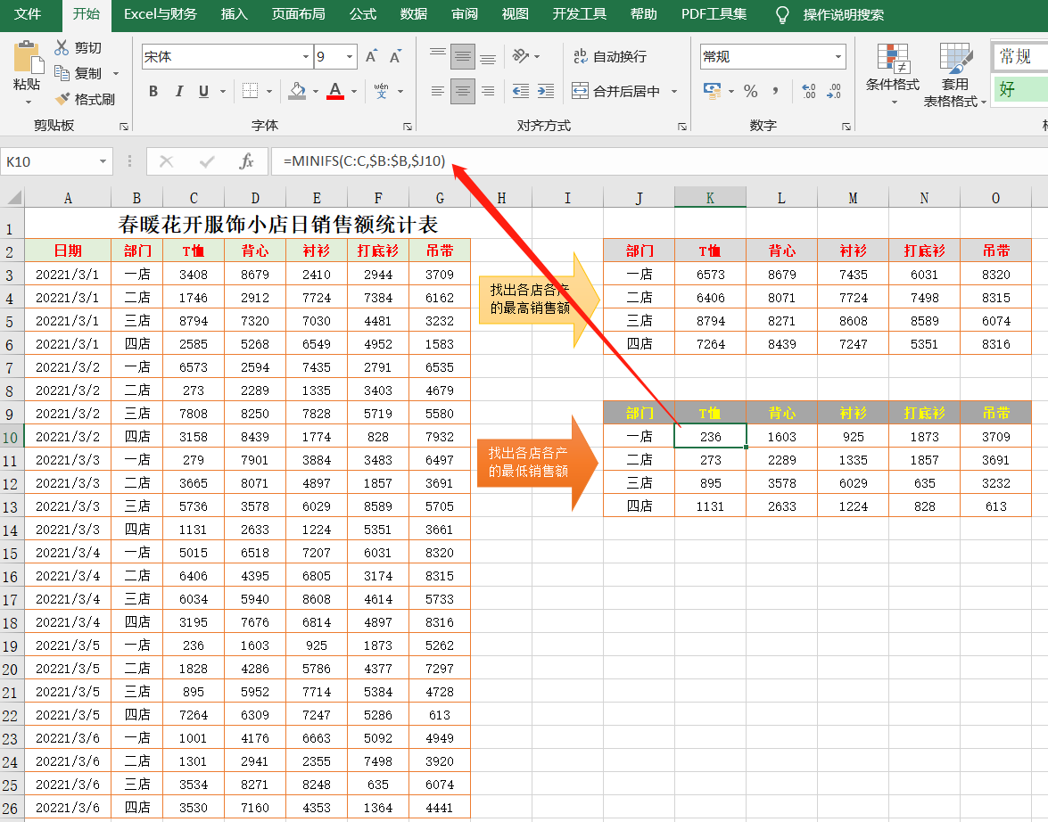 用到的公式:=MINIFS(C:C,$B:$B,$J10)