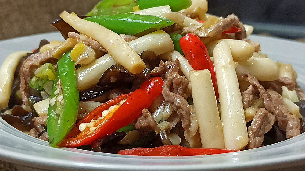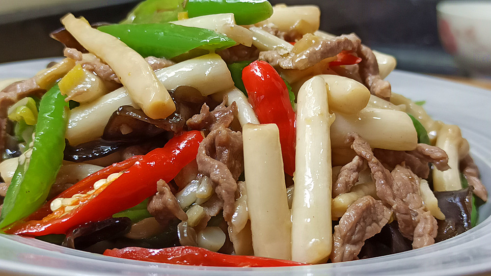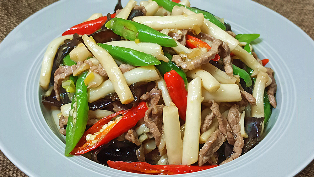 【制作主料】:海鲜菇300克、泡发木耳50克、青红尖椒各2个、猪瘦肉50克