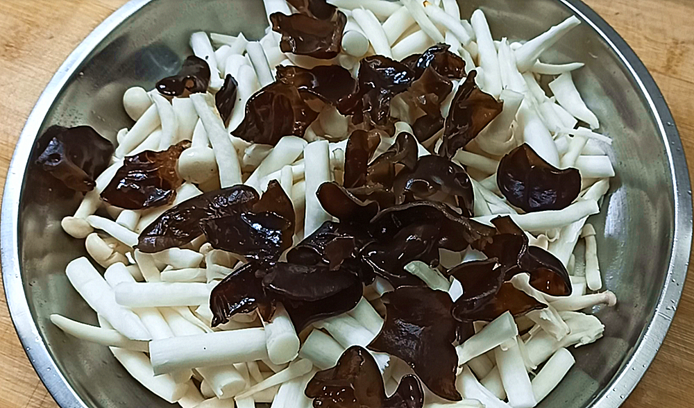 【步骤一】:把海鲜菇放盆中用盐水浸泡10分钟,主要是去除农药残留和杂质,然后冲洗干净把水沥干切成小段,把泡发的木耳洗干净后切成小块放盘子中备用。