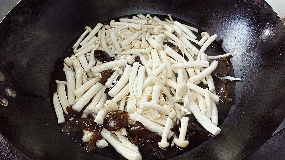 【步骤三】:锅中添水大火烧开,然后把海鲜菇和木耳放锅中焯水1分钟,把海鲜菇焯断生,同时去除异味和草酸,然后捞出来把水分沥干备用。