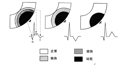 梗死性Q波是在冠状动脉病变基础上发生冠状动脉血供急剧减少或中断,使相应心肌严重持久地急性缺血导致坏死;而新近规定心肌缺血引发面积大小不同的心肌坏死都为MI。