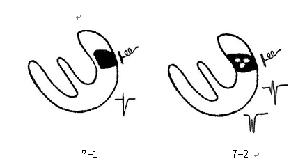 图7等位性Q波形成示意图,7-1图显示顿抑存活心肌电功能恢复,面对电极的向量形成r波。7-2图显示顿抑存活心肌与坏死心肌相对位置不同而形成多种形态QRS波。