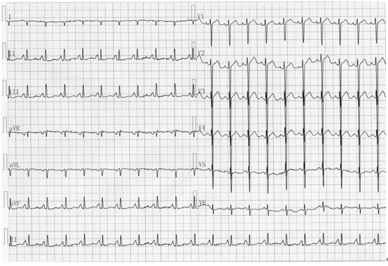 图19-1患者男,48岁,因急性胰腺炎就诊,心电图显示右位心(左右手正常连接)。