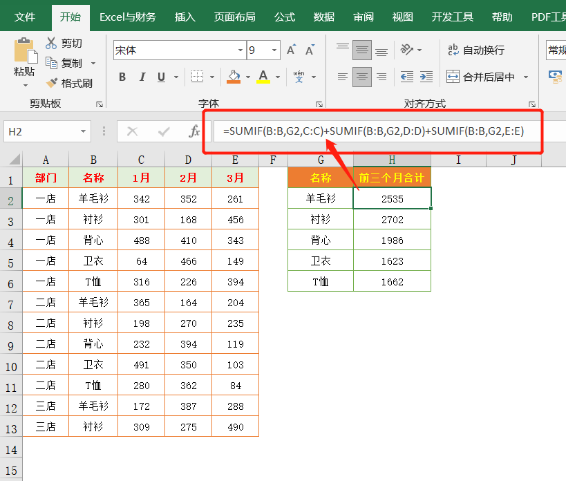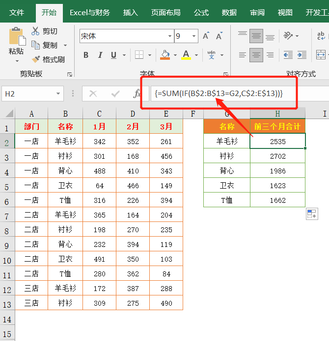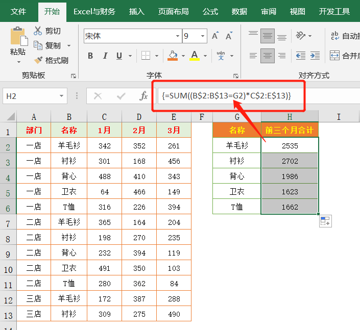 这个公式与上一个比较省了IF函数判断,利用B$2:B$13=G2产生的逻辑值(0和1)与数据区域相乘。