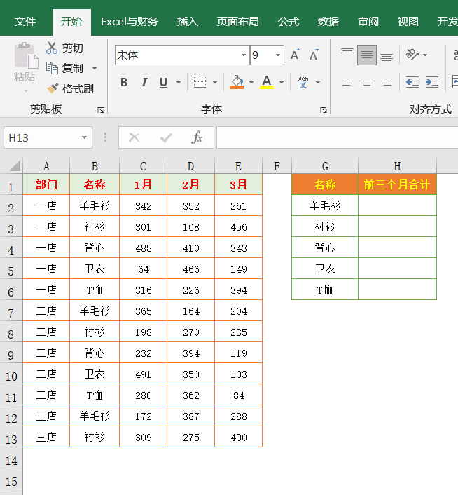 实例:下图表格中,要求计算各产品的前三个月销量合计数;