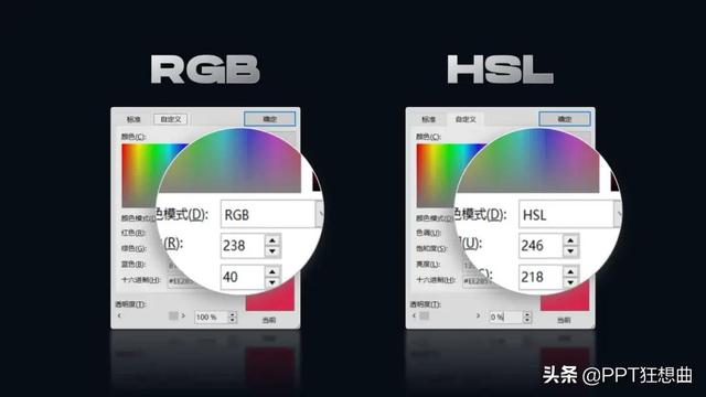 我们知道 ,在PowerPoint 中有两种颜色模式 :RGB 和 HSL