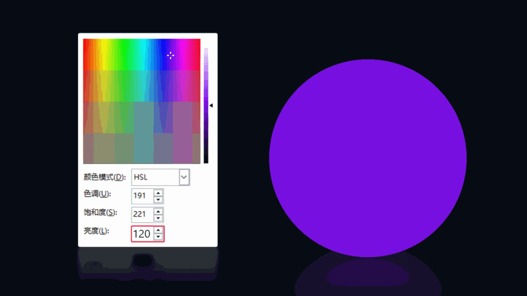 我们尝试改变亮度(L)的数值,会发现随着数值的变化,圆的颜色也会随之变化: