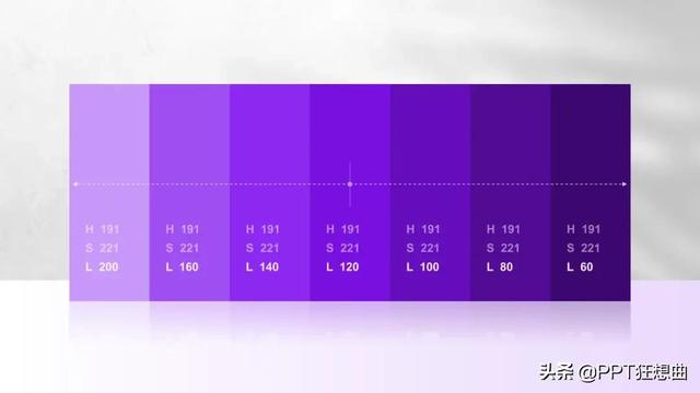 保持颜色的色调、饱和度不变,然后通过改变颜色的亮度数值,来获得不同亮度层级的颜色搭配。