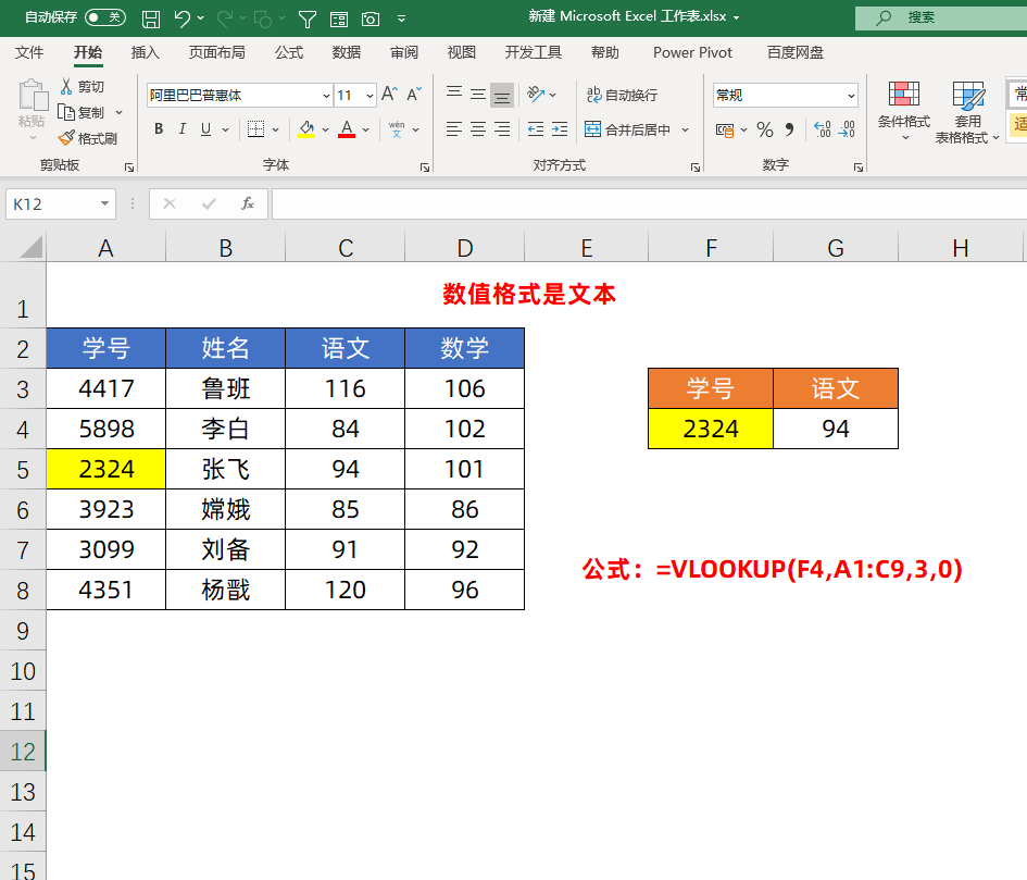 如下图,我们根据2324这个学号来查找语文成绩,数据表中也是有学号2324与之对应的语文成绩的,公式为:=VLOOKUP(F4,A1:C9,3,0),也是正确的,可函数还是返回#N/A这个错误值