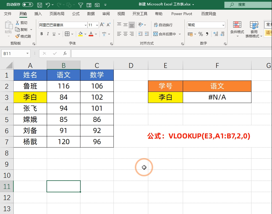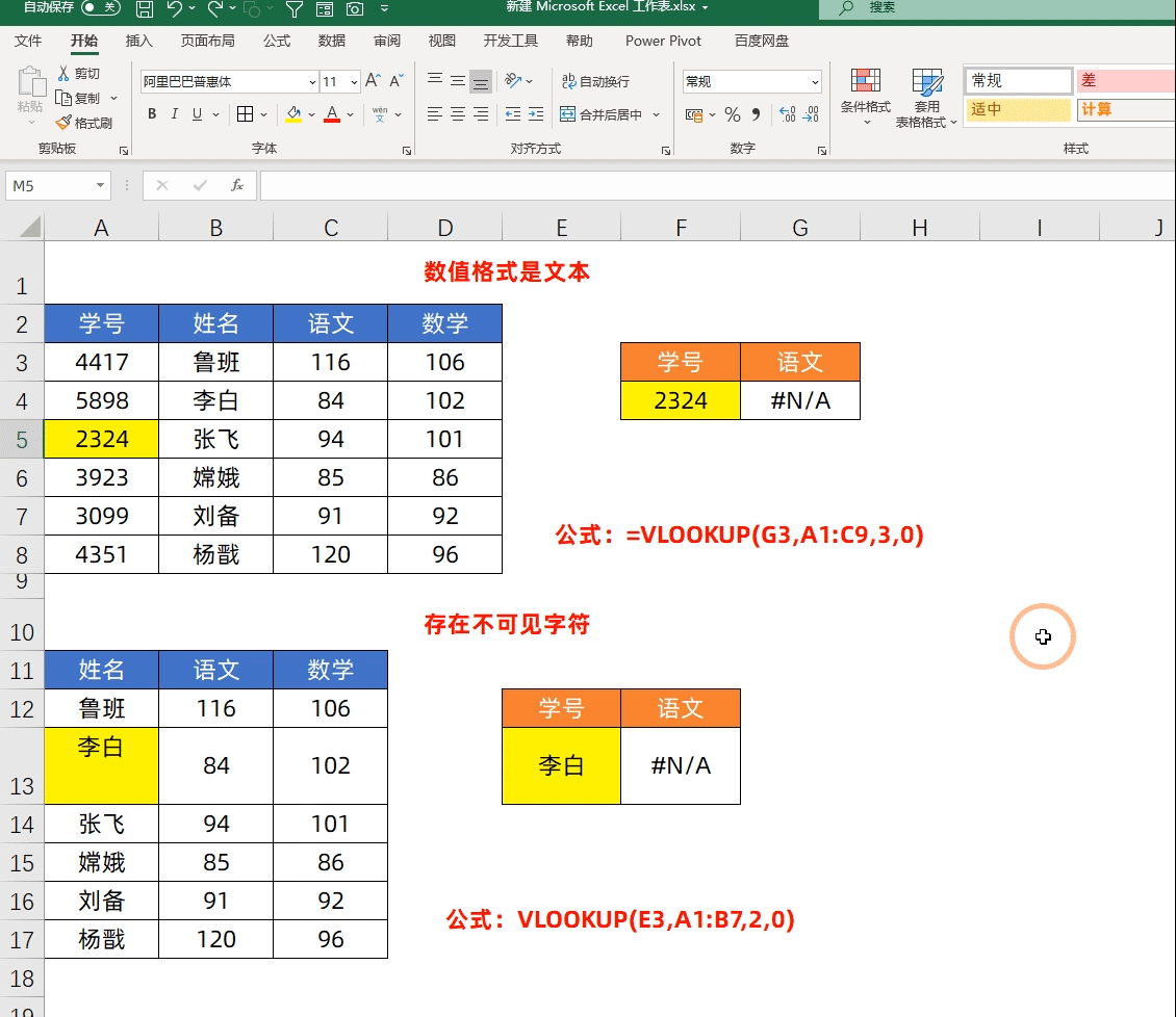 这种情况常见于从系统中导出的数据。如下图我们根据李白来查找语文成绩,公式也正确的但是结果依然为错误值,这是因为在数据中存在一个换行符,当我们点击自动换行后,换行符才会显示出来,我们将换行符删除后就可以找到正确的结果了,系统中导出的数据符号有很多是Excel不能识别的,Excel是不会做任何显示的