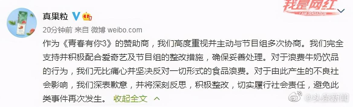 事实上,在蒙牛道歉之前的5月6日夜间,爱奇艺就已发文道歉,称对于“倒奶视频”所造成的影响表达歉意。爱奇艺称,从发文即刻起,关闭《青春有你》第三季所有助力通道。