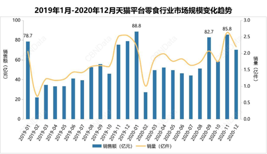 而在新冠疫情流行期间,零食更成为消费者疏解情绪,打发无聊时间的重要选择。数据显示,仅在天猫平台,2020年零食行业的销售额就达到了707.0亿元,同比增长19.5%。